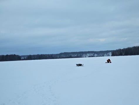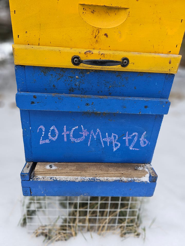 There have been a few bee sightings, when they’ve come out to take cleansing flights and remove their dead. On Christmas Eve, we could hear a couple of the colonies buzzing from inside their hives, so loudly that they were audible from several feet away. This is right and proper, in accordance with bee folklore; they are to hum loudly at Christmas in praise to the newborn King. We chalked their hives on Epiphany, with prayers for their health (as described in this post from last year).